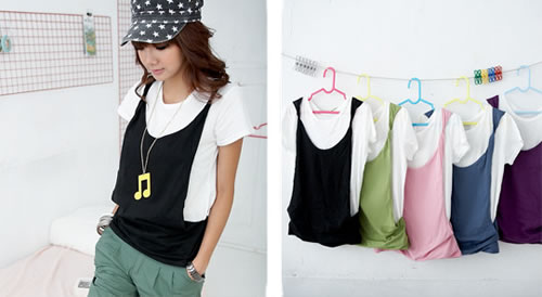 韓版假兩件捲捲螺旋肩帶後T字上衣