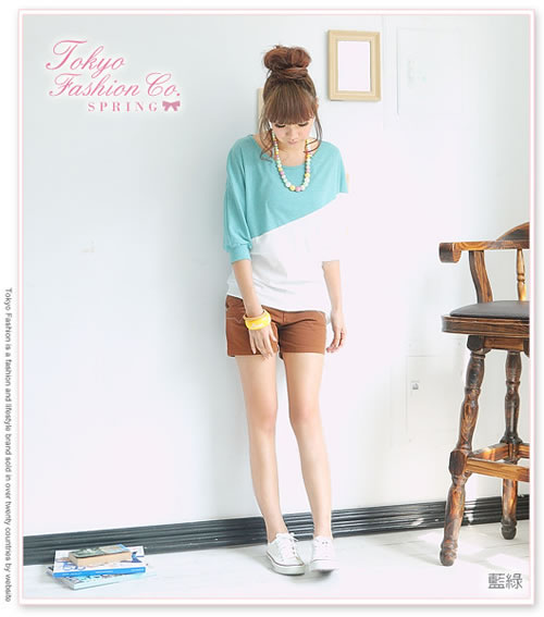 斜配色側綁結棉質上衣