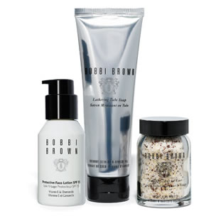 hree steps to a fresh, sparkling-clean complexion: Bobbi’s ultimate skincare starter kit contains her creamy Lathering Tube Soap (4.2 oz./125ml) to take off all traces of dirt and makeup. Sprinkle in someBuffing Grains (.99 oz./28 g), and the lather becomes a gentle yet effective polishing scrub. Protective Face Lotion SPF 15 (1.7 oz./50 ml), keeps skin hydrated and protected.